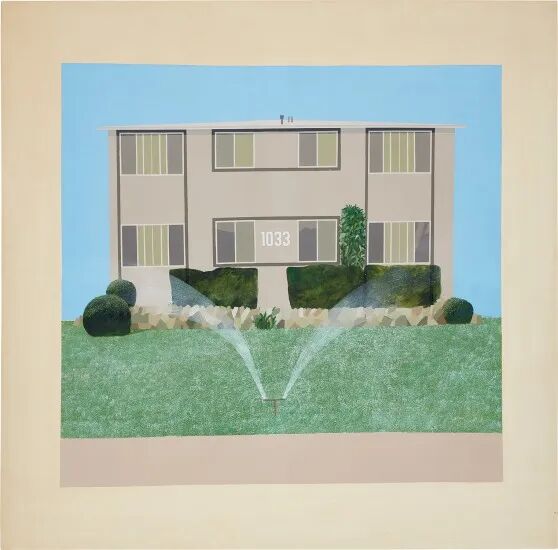 《比弗利山庄主妇》(1966-67)是一幅12英尺长的丙烯作品,描绘的是收藏家贝蒂·弗里曼(Betty Freeman)穿着一件热粉色长裙站在自己的泳池边。2008年这幅画在纽约佳士得拍卖会上以790万美元的价格拍出,成为那次拍卖中成交价最高的一幅。