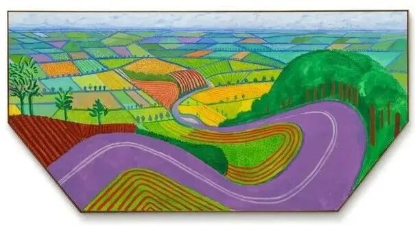 展览中有一件霍克尼在六块画布上创作的他所谓的“反透视”组画,道路在两排树木之间展开,远处的空间没有收缩,而是向外延伸。火红的农舍,祖母绿的农田。其他重要作品还包括霍克尼在1970年时画的《泉水公园》(Le Parc des Sources, Vichy),展览将展至8月29日。