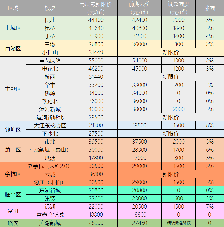 杭州第三次土拍落幕,限价全部落定,总共35宗宅地,25个板块,去除5个全新限价和5个限价基本未变外,15个板块限价全部上浮。