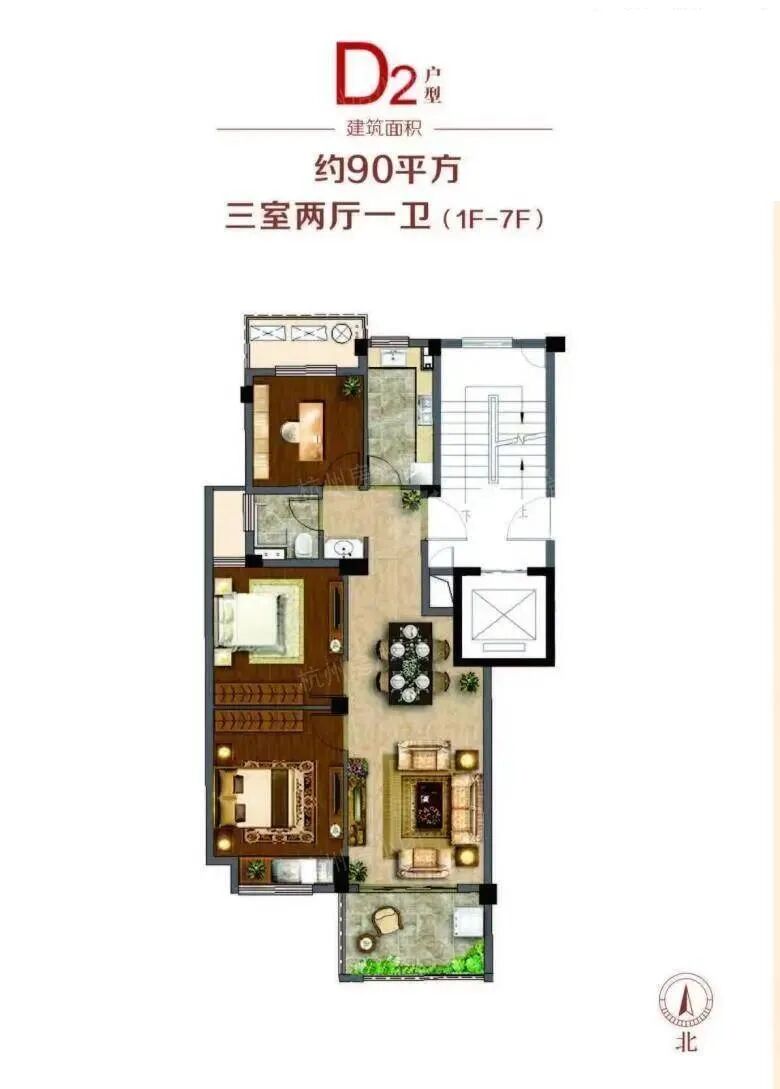 优点:南向带大面宽阳台;U型厨房;小储藏间设计;公卫干湿分离;