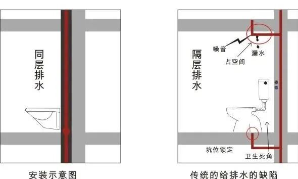 好处显而易见,楼下再也不会听到经过管道放大的冲水啸声,甚至也可以根除坑位锁定、弯道存水卫生死角、以及接缝处漏水的弊病,但同时也存在检修困难的缺陷,需要施工品质保证。