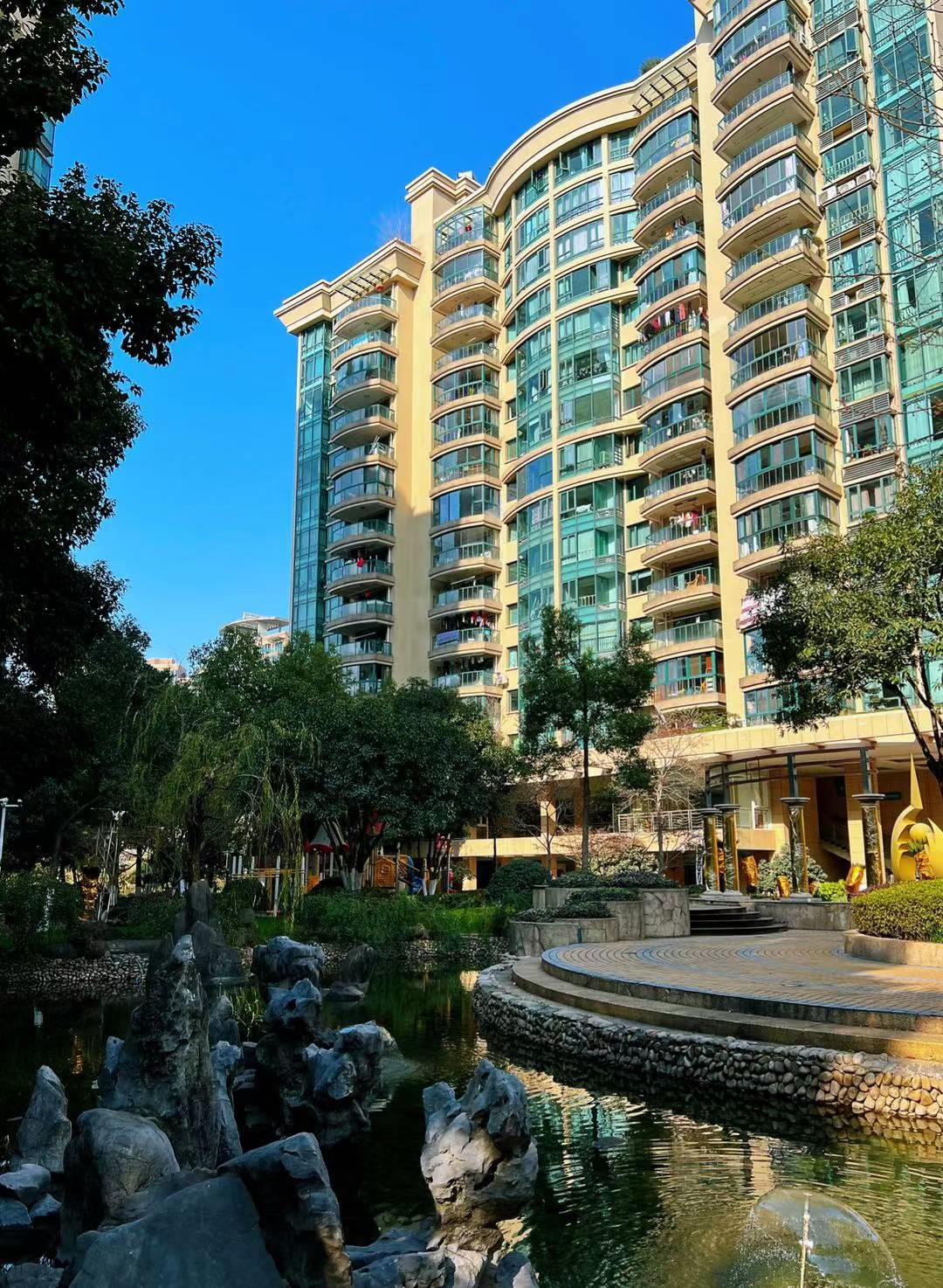总体园林设计风格虽有点杂,但建筑围合出的中央庭院,入院的雕塑小品为分界,东边是峰峦叠嶂的中式假山半包围着室外泳池。