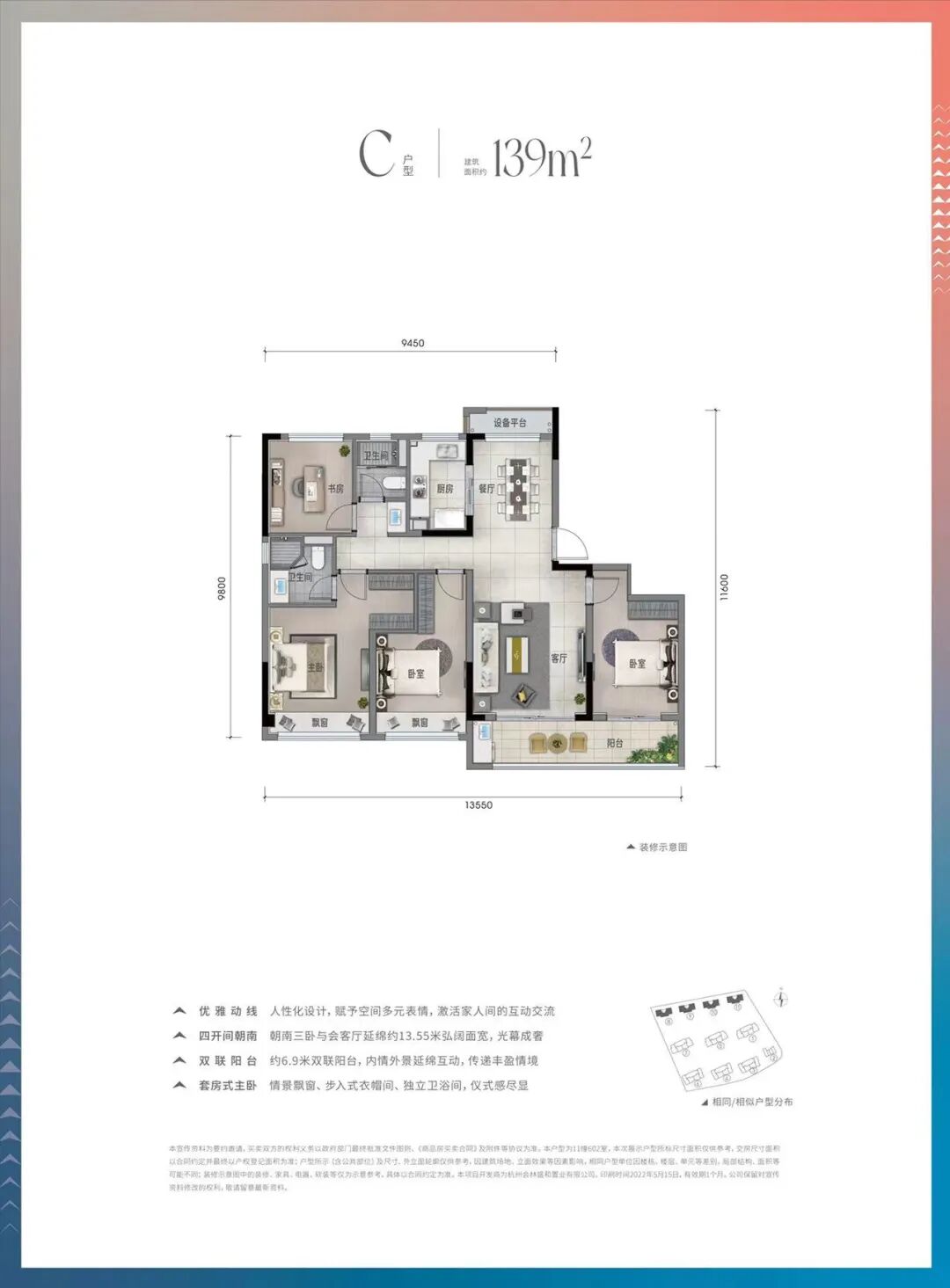 值得一提的是,楼盘除了纯139户型的改善楼幢是两梯两户外,其余楼幢皆为分离式的两梯四户设计。