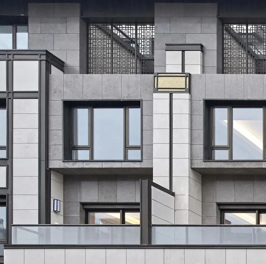 高层住宅外立面设计与选材上寻求细腻感,基座全石材干挂,与主体铝板干挂的结合,同时不同颗粒质感和色调铝板拼贴,形成了细腻生动、富于变化的建筑表情,既简约挺拔,又符合现代审美。