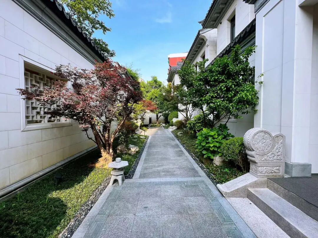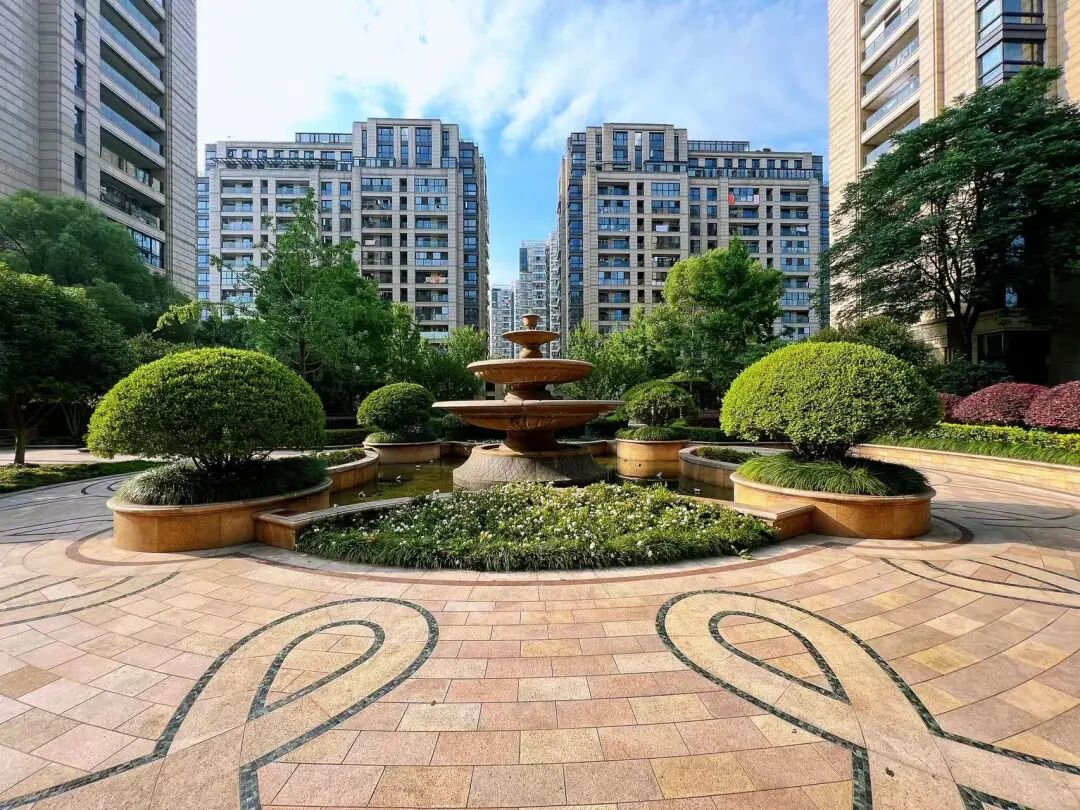 而整个园林以许愿池、喷水花钵为中轴线,大香樟、沙朴、大银杏、榉树,与不同季节的植被搭配,高大的乔木,加上中层的花、果木以及绿毯似的草坪,形成了立体的空间搭配;