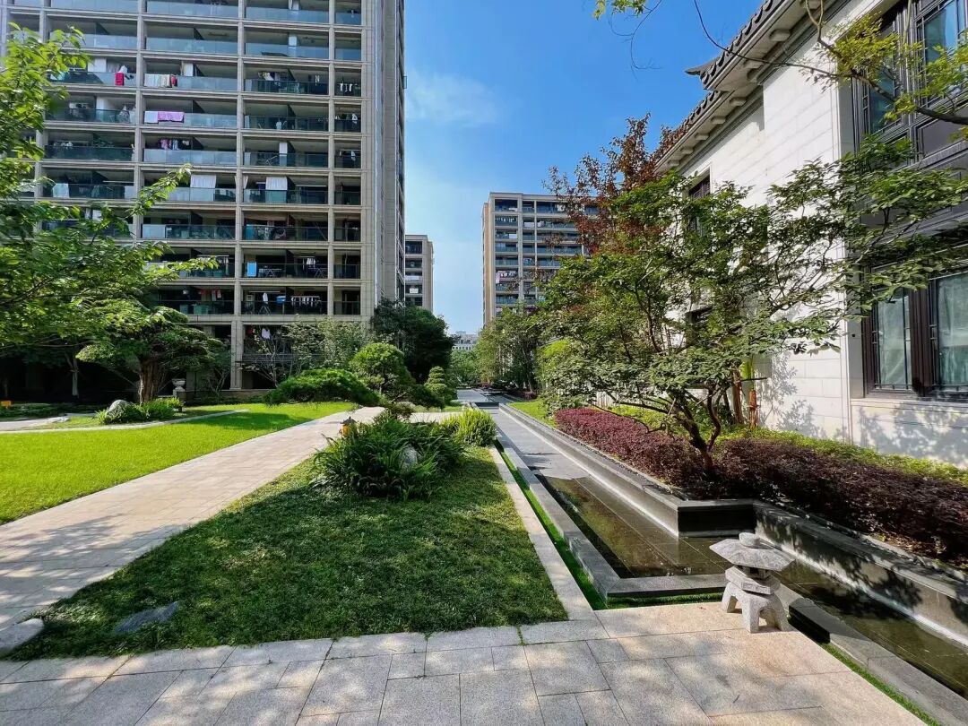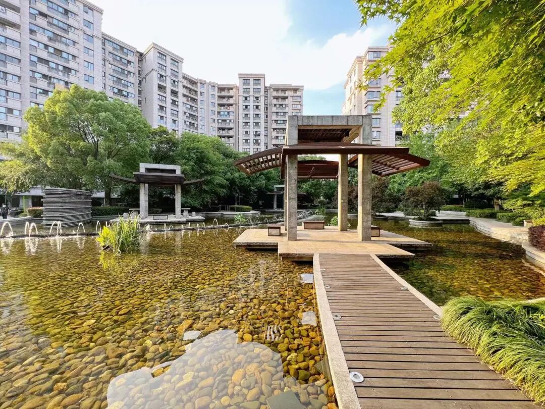 二重院,逾10000㎡的社区特色园林,在六栋“画廊式”布局的建筑围合下,形成大小错落的中心水景景观区和节点景观带,亭台水榭,步道小品,绣球花钵……让每扇窗都收藏运河的风景。