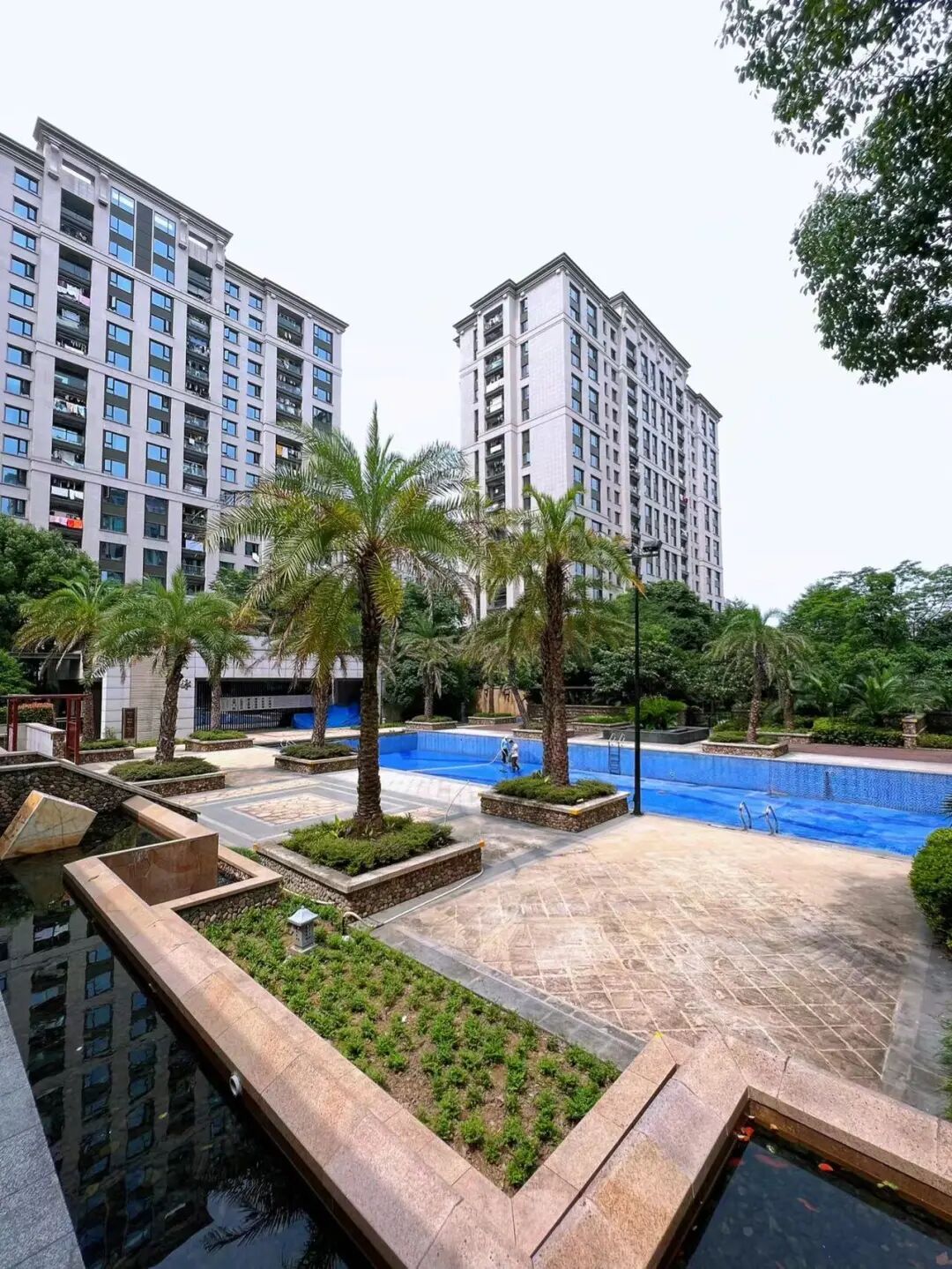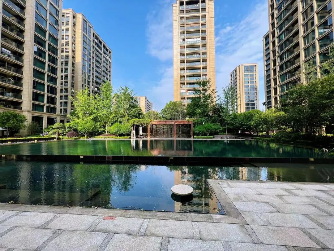 而五星级酒店式入口大堂、石材干挂立面、无边镜面泳池、枯山水、树阵、模纹花坛、排屋区的曲池流觞……等景观营造,虽然与亚运村桂冠东方景观相比差了点火候,但相对那个时代,还是处在较高水平。