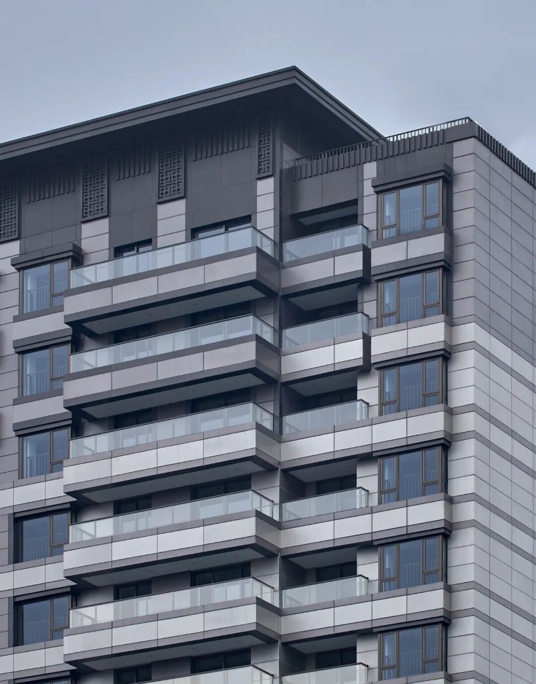 再通过转角窗、金属栏杆,容纳入大进深、大面宽的阳台,丰富室外可用空间的同时,形成层次错落的凹凸面,庄重大气;