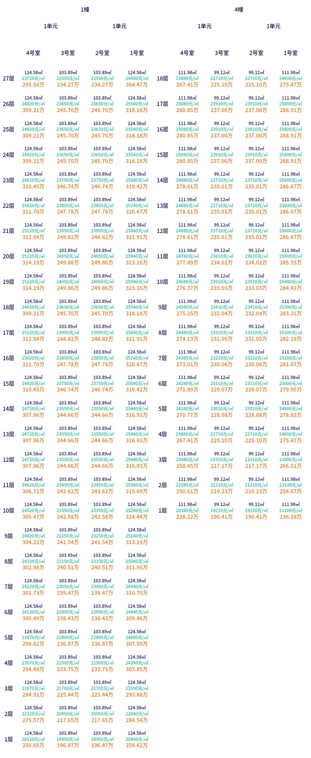 5. 价格因素:1号楼总层数为27F,总价最高在19、20F,往上至24F每层之间价差约1-2万元,24-26F价格一致;往下每层之间价差约1-2万元,18F价差明显,不介意可考虑;14F与13F价格一致;