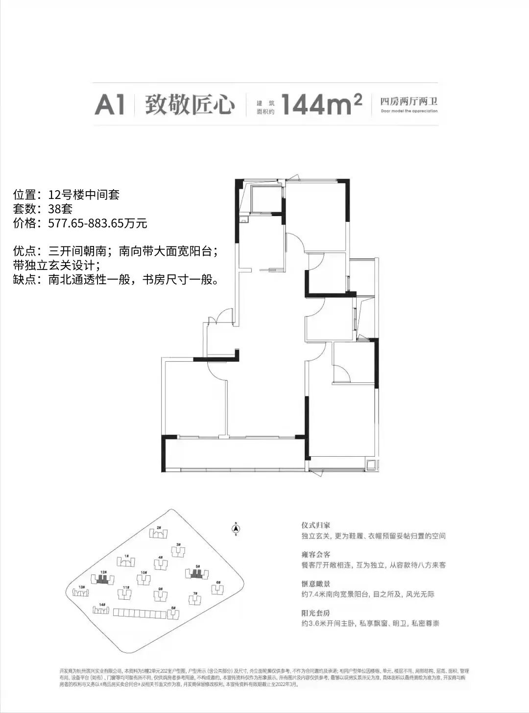 整盘精装限价6.6万元/㎡,收官套数263套,主力户型约144-195㎡,总价起步约578万元。