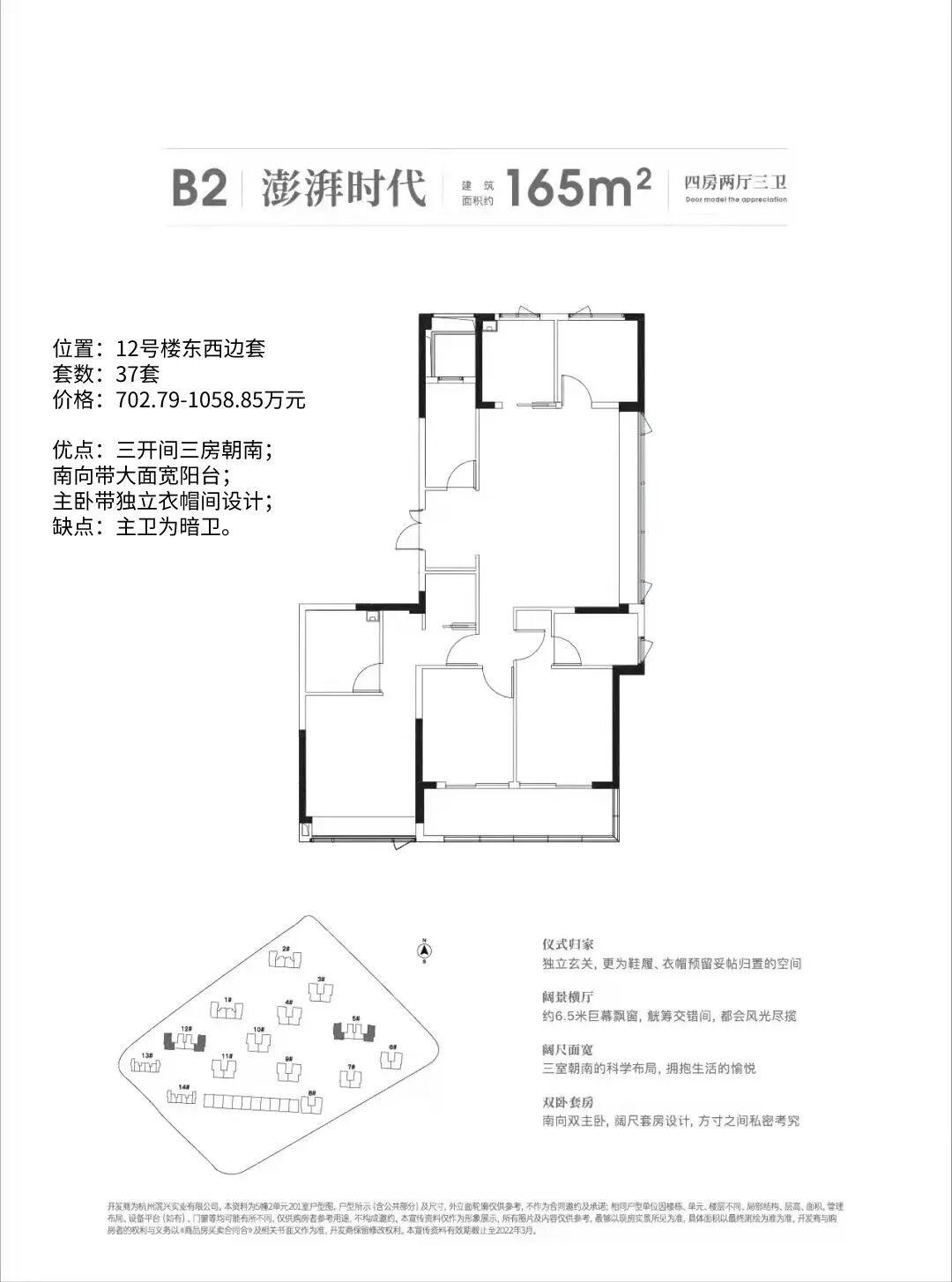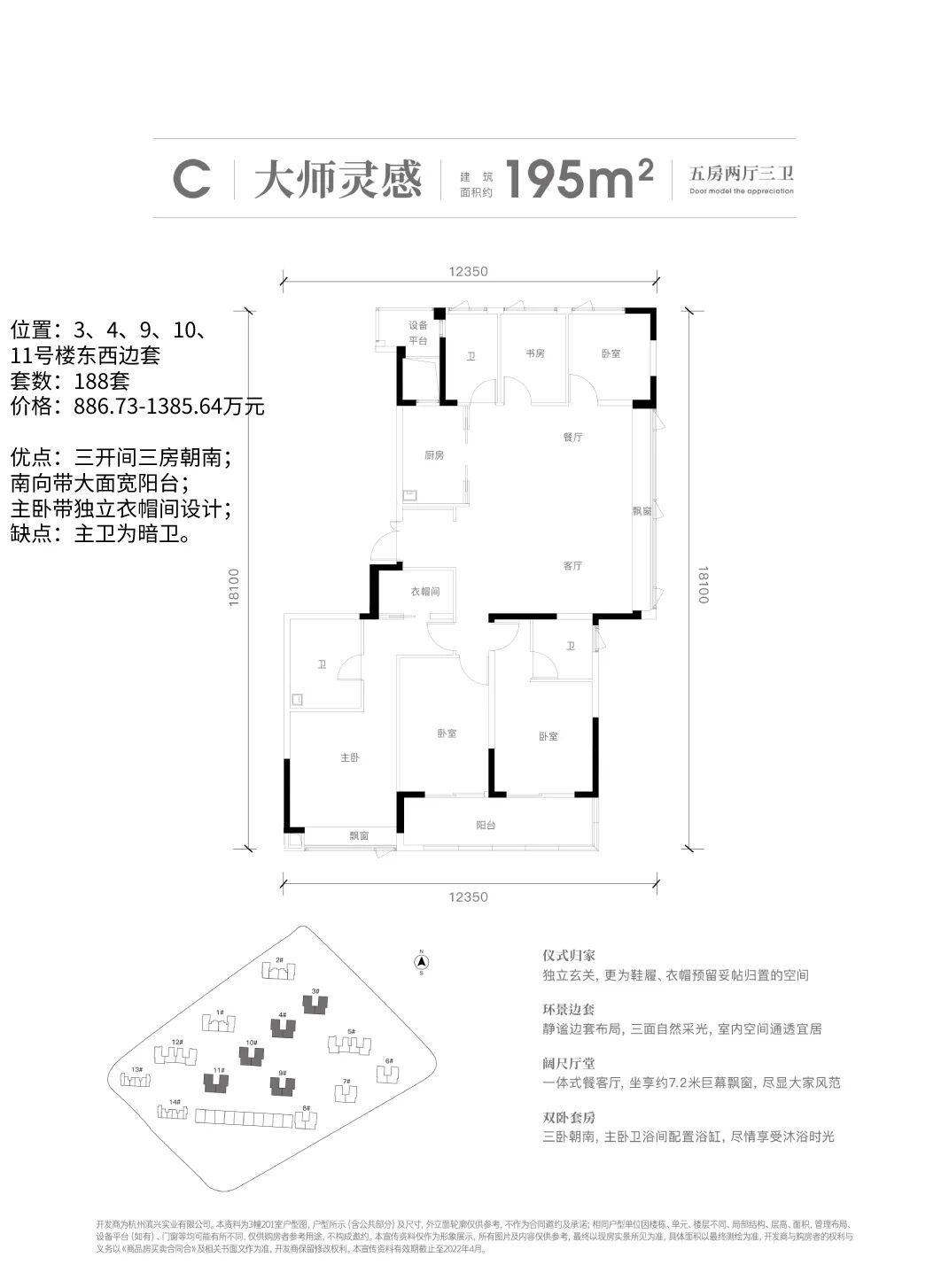 1.所处位置:约144㎡为12号楼中间套,约165㎡为12号楼东西边套,约195㎡为3、4、9、10、11号楼东西边套;
