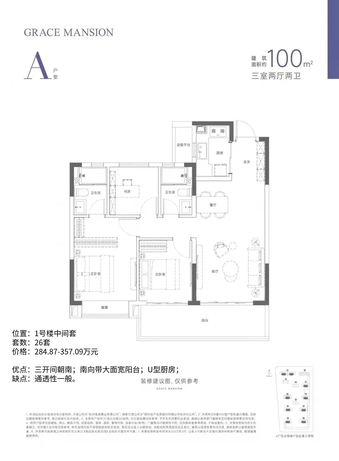 1.所处位置:约100㎡为1号楼中间套,约110㎡为1号楼东边套,约122㎡为1号楼西边套,约148㎡为9号楼东西边套;