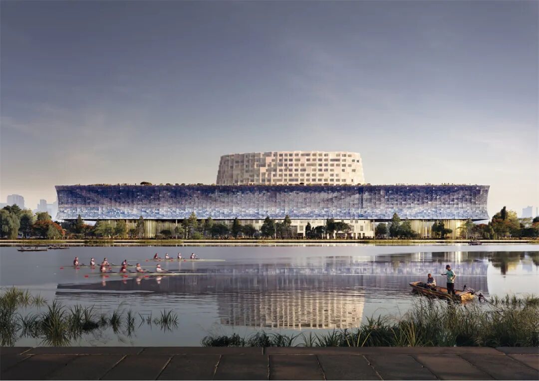 主材为铝板打造、弧度微微上扬的飞檐,将来从运河湾望过来,形似中国书法里的写意一捺,别有一番飘逸灵动。