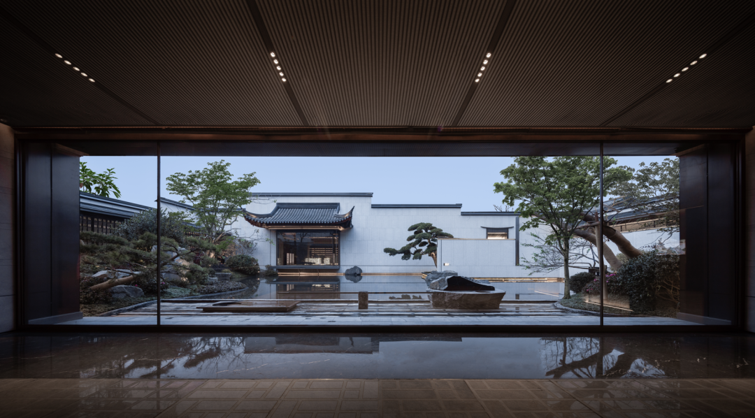 而主入口约40米宽歇山顶,宋风檐角的新中式门厅,两侧是错落有致的马头墙,两株罗汉松、两尊铜狮分列左右;