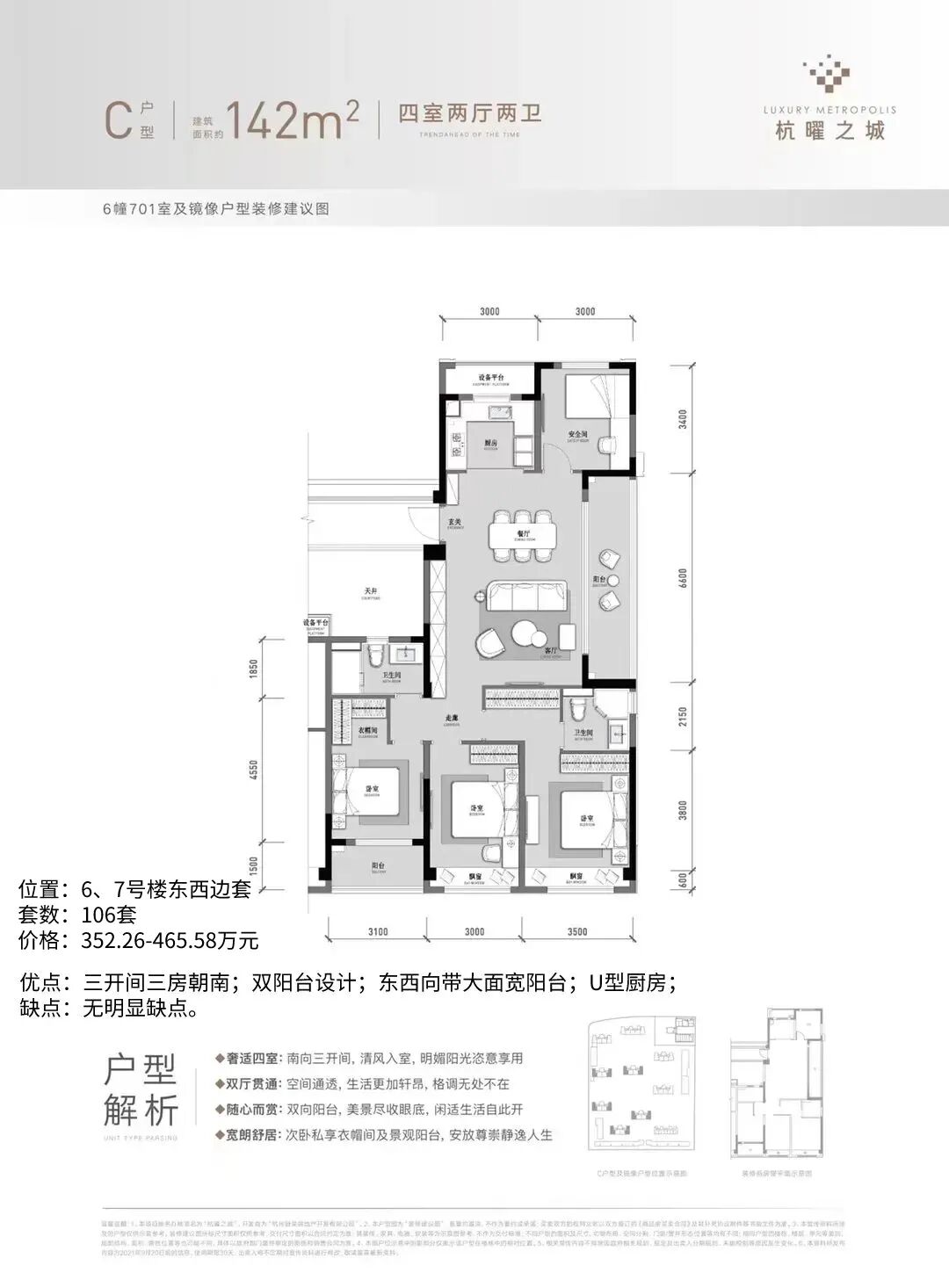 1. 所处位置:均处在6、7号楼,约105㎡为中间套,约142㎡为东西边套;