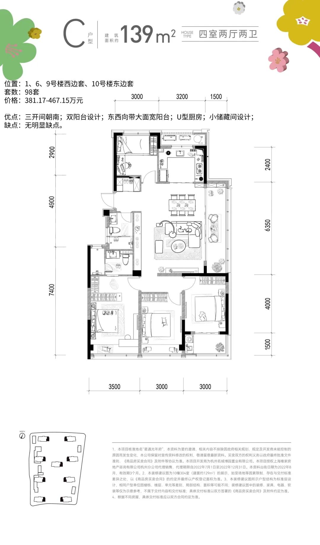 1. 所处位置:约105㎡为1、6、9、10号楼中间套,约129㎡为1、6、9号楼东边套、10号楼西边套,约139㎡为1、6、9号楼西边套、10号楼东边套;