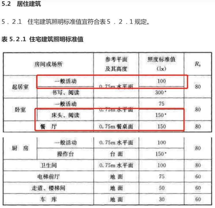 【建筑照明设计标准】GB-50034-2013的5.2的民居住宅照明标准值,如下图,基础照明要求在100lx,即在0.75米的高度,用显色度80的灯泡,每㎡要有100-150lm的光通量,可以让这个房间基本活动被均匀点亮,规范实验的作业面与周围环境光通量约有25%的折损;