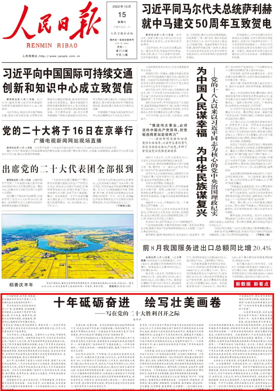 盼望着、奋斗着、创造着,举世瞩目的中国共产党第二十次全国代表大会就要胜利召开了。多次见证重大历史时刻的天安门广场,花团锦簇、红旗招展;深圳莲花山公园里十年前种下的高山榕,亭亭如盖、枝繁叶茂;蓬勃生长的雄安新区,机械轰鸣、塔吊林立;翱翔寰宇的中国空间站,“太空出差”的航天员们全神贯注、有条不紊……历经岁月洗礼,世界东方的这片热土欣欣向荣;满怀豪情壮志,亿万人民在党的领导下奋勇争先。日月开新元,万象启新篇。从党的十八大开始,中国特色社会主义进入新时代。回顾新时代这十年,习近平总书记深刻总结:“党的十八大以来,党中央团结带领全党全国各族人民,攻克了许多长期没有解决的难题,办成了许多事关长远的大事要事,经受住了来自政治、经济、意识形态、自然界等方面的风险挑战考验,党和国家事业取得历史性成就、发生历史性变革,为实现中华民族伟大复兴提供了更为完善的制度保证、更为坚实的物质基础、更为主动的精神力量。”这十年,我们铸就了激荡人心的东方传奇,赢得了令人惊叹的大国荣光,一个古老民族迎来了从站起来、富起来到强起来的伟大飞跃,实现中华民族伟大复兴进入了不可逆转的历史进程。习近平总书记强调:“新时代10年的伟大变革,在党史、新中国史、改革开放史、社会主义发展史、中华民族发展史上具有里程碑意义。”时间镌刻不朽,奋斗成就永恒,十年砥砺奋进,历史的如椽巨笔绘写壮美画卷。如红日东升,如大潮奔涌,如长风浩荡,向上向前的力量蕴藏在每一寸生机勃勃的土地上,向着未来无限伸展。大道如砥,大势如潮。当历史的指针指向2022年的金秋十月,矢志复兴的中华民族,行进到关键一程的关键节点。向着更加开阔的天地进发,“全面推进中华民族伟大复兴”的号角嘹亮,神州大地奏响“强国复兴有我”的激扬乐章。东方红LF2204无人驾驶拖拉机,贵州省独山县下司村脱贫攻坚尖刀排队旗,高精密机床主轴轴承和滚动功能部件……北京展览馆,“奋进新时代”主题成就展上,一件件实物模型、一段段生动视频、一幅幅图片图表,展现了新时代十年的不凡历程。2012年至2022年,十年跨越,交出彪炳史册的时代答卷。2021年,我国经济总量突破114万亿元,占世界经济比重超过18%,人均国内生产总值超过1.2万美元,接近高收入国家门槛;2013年至2021年,国内生产总值年均增长6.6%,对世界经济增长的平均贡献率达到38.6%,超过G7国家贡献率的总和,是推动世界经济增长的第一动力;打赢脱贫攻坚战让近1亿人口摘掉绝对贫困的帽子,全面建成小康社会让千年梦想照进现实;全面建设社会主义现代化国家新征程顺利开启,国家经济实力、科技实力、综合国力跃上新台阶……感天动地的奋斗史诗、震古烁今的伟大成就,书写在民族复兴的伟大征程上,刻印在中华儿女的共同记忆中。锦绣山河为名,非凡十年为证,我们完成了一段伟大的历史书写。《中共中央关于党的百年奋斗重大成就和历史经验的决议》从13个方面分领域总结了新时代中国特色社会主义的伟大成就,党领导人民创造的这些成就背后,蕴藏着多少运筹帷幄的胆识,包含着多少气贯长虹的行进,凝聚着多少震撼人心的巨变。在以习近平同志为核心的党中央坚强领导下,在习近平新时代中国特色社会主义思想科学指引下,一个浓墨重彩的十年,在人类的伟大时间历史中创造了中华民族的伟大历史时间——从党史看,这是矢志不渝践行初心使命的十年。十年前,习近平总书记一句“打铁还需自身硬”,让无数人印象深刻。十年来,无论是坚持和加强党对一切工作的领导,解决落实党的领导弱化、虚化、淡化、边缘化问题,还是“八项规定”激浊扬清、反腐败斗争取得压倒性胜利并全面巩固,根本扭转管党治党宽松软状况,一个百年大党擦亮初心、铸牢使命,刀刃向内、自我革命,重整行装再出发。十年夯基垒台,党的政治领导力、思想引领力、群众组织力、社会号召力显著增强,党在革命性锻造中更加坚强。从新中国史看,这是滚石上山走向“强起来”的十年。“中国要强大,各领域各方面都要强起来。”制造强国、科技强国、质量强国、航天强国、网络强国、交通强国、海洋强国、贸易强国、文化强国、体育强国、教育强国、人才强国……我们锚定目标,跨越发展谋蝶变,强国之路正扬帆。十年风雨兼程,我们迎来了从落后时代、跟上时代再到引领时代的伟大跨越,越来越多人相信“全球未来的新希望来自中国”“21世纪世界发展的面貌取决于中国”。从改革开放史看,这是全面深化改革不断向广度和深度进军的十年。经济体制改革紧锣密鼓,政治体制改革不断深化,文化体制改革激活春水,社会体制改革持续创新,生态文明体制改革步履铿锵,国防和军队改革大刀阔斧,党的建设制度改革扎实推进……改革实现由局部探索、破冰突围到系统集成、全面深化的转变。从统筹推进21个自贸试验区建设、高质量建设海南自由贸易港到举办进博会、服贸会、广交会、消博会,从颁布实施外商投资法到连续5年缩减外资准入负面清单……中国开放的大门越开越大,全方位、多层次、宽领域的全面开放新格局加速形成,中国的发展成为世界的机遇。十年日生不滞,改革开放开创新局面,让中国特色社会主义制度更加成熟更加定型,国家治理体系和治理能力现代化水平不断