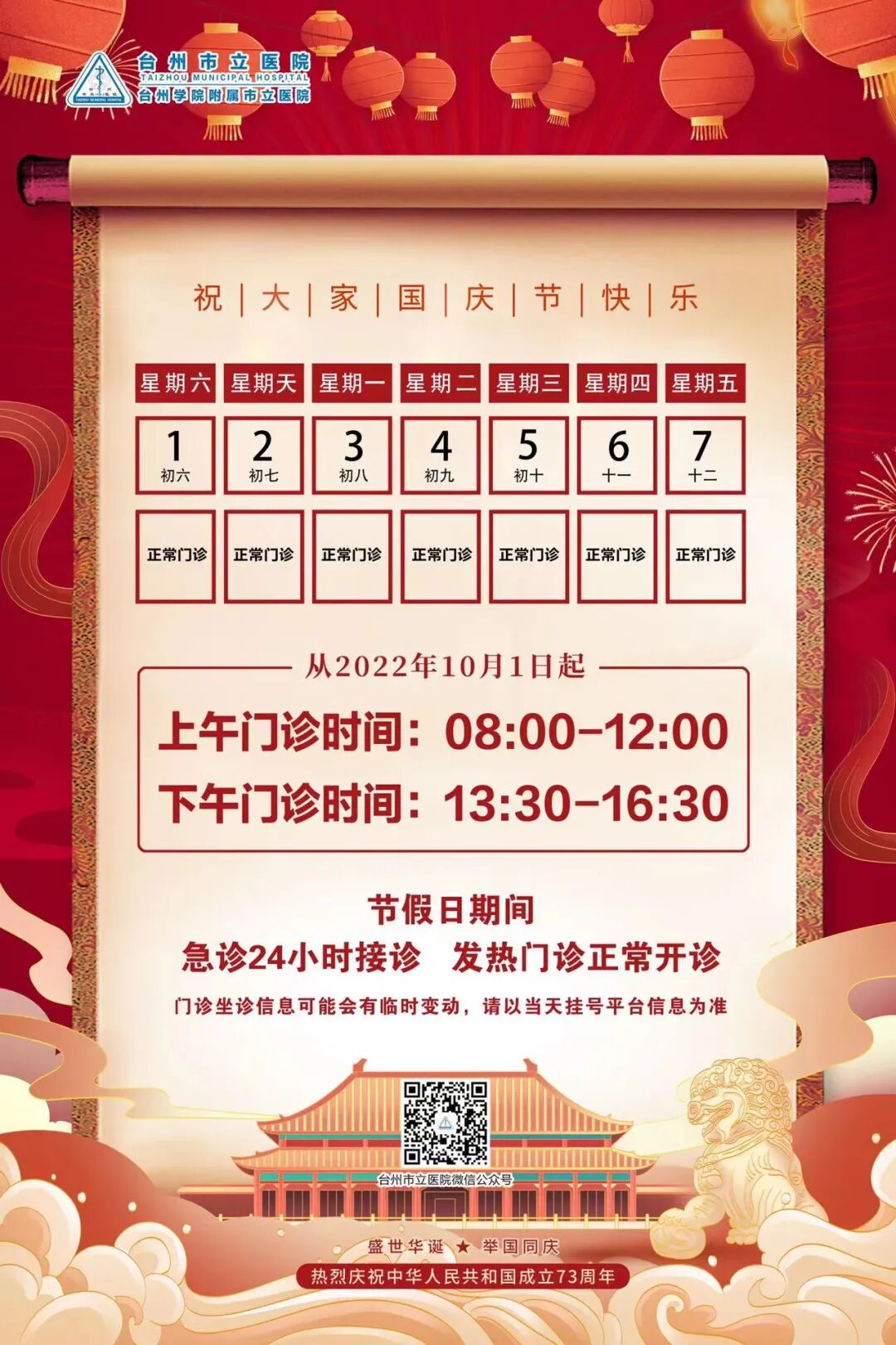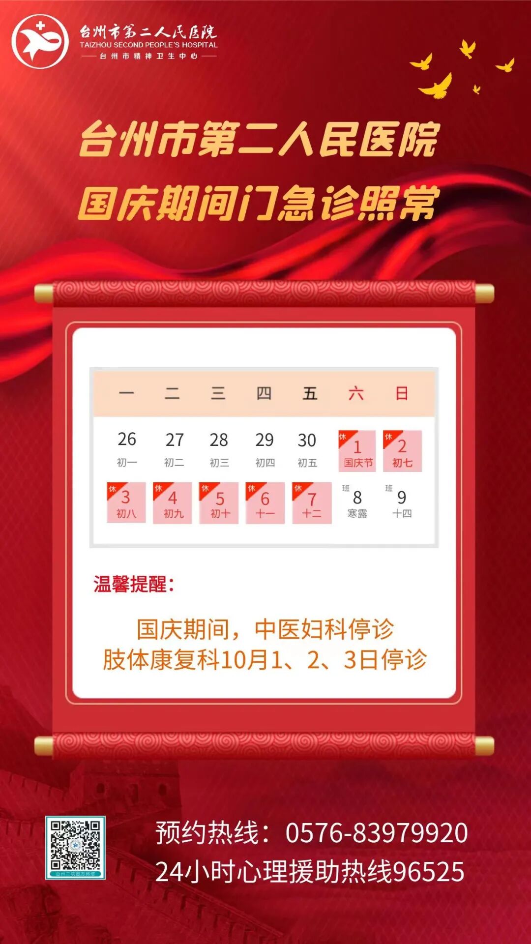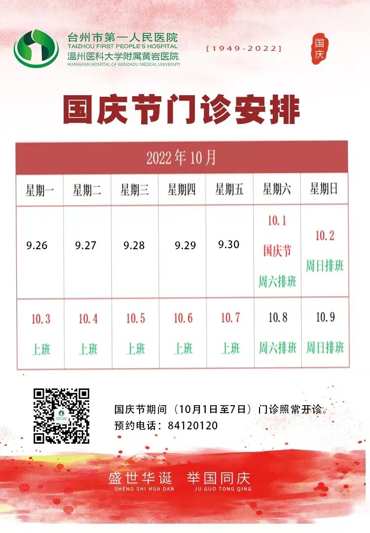 温馨提醒:国庆期间排班详情,请关注各大医院公众号(服务号),或拨打各医院电话详询。