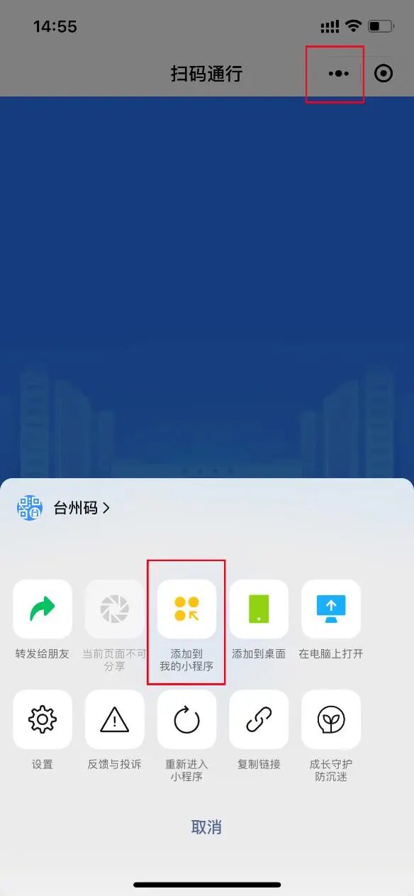 ①用微信扫一扫识别下方小程序码,或者在微信中搜索“台州码”,选择“小程序”的搜索结果,向下滑动一小段,即可找到名称后有“政府”备注的“台州码”小程序。打开后点击右上角,选择“添加到我的小程序”。