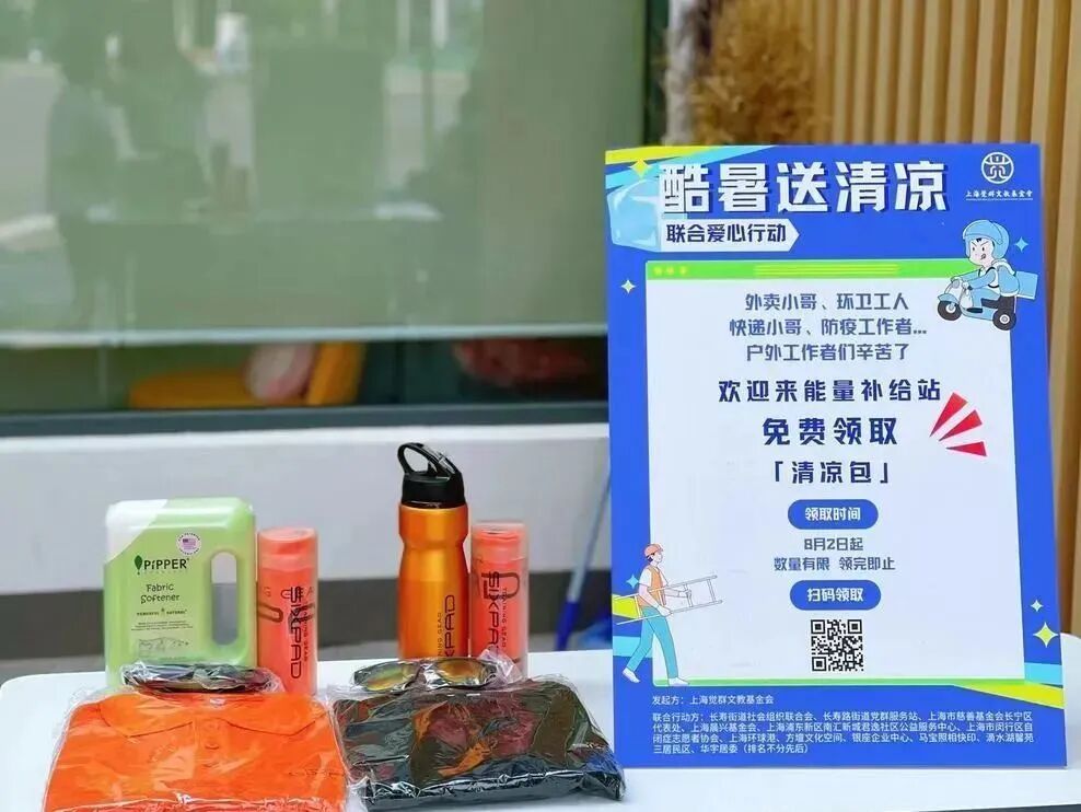 上海天气持续炎热,一份份清凉包为外卖送餐员、快递小哥、环卫工人、道路建设施工者、防疫工作者、城管执法工作者、交警指战员等高温一线工作者带去了一丝清凉和一份关爱!