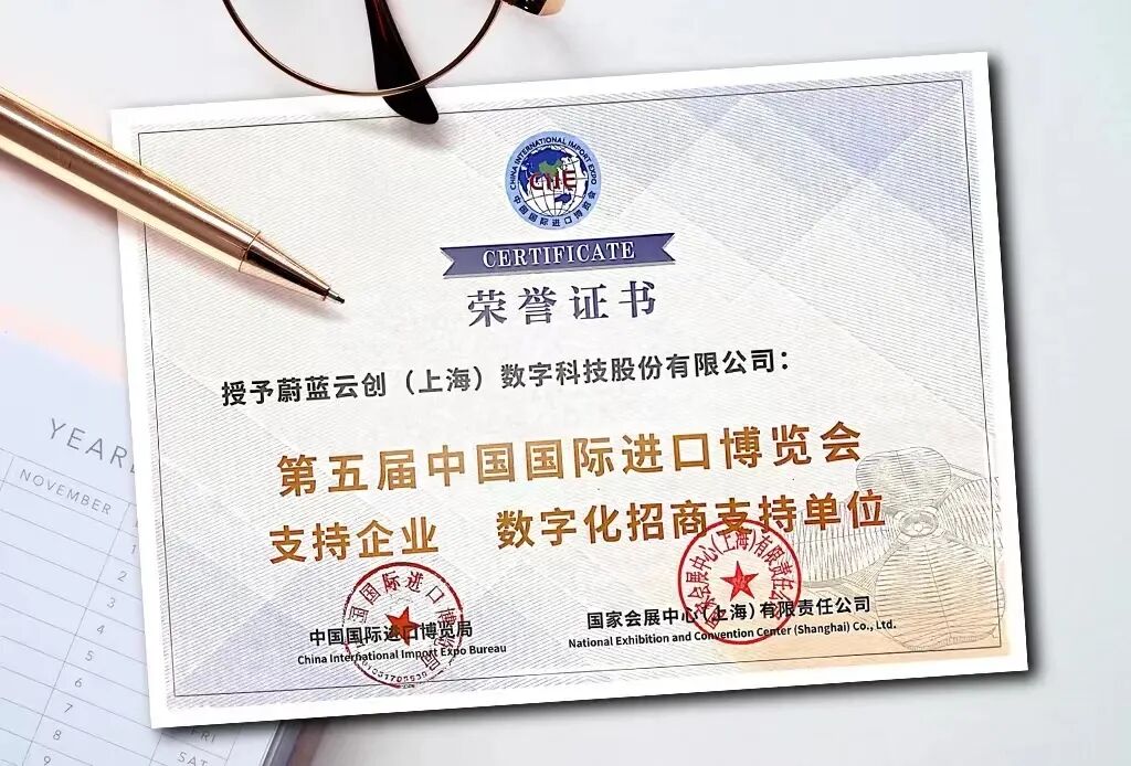 蔚蓝云创被授予“第五届中国国际进口博览会支持企业”及“第五届中国国际进口博览会数字化招商支持单位”称号