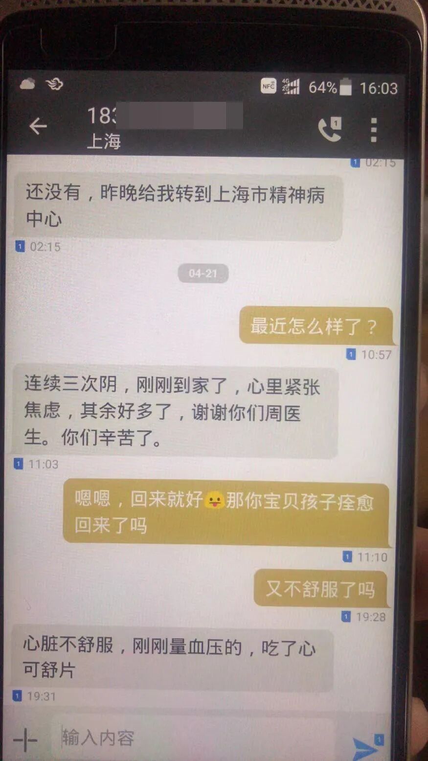 “4月8日12点,居委会将一个居民的信息发在石泉社卫医疗保障群内,我们当天的值班医生周迎欢第一时间就电话联系了她,原来他们一家都是‘小阳人’,她非常害怕,又不敢表露出,事情压在心里,特别紧张焦虑。电话那头,居民不停地在哭泣、整个人的状态是比较奔溃的。”周医生通过不停地和她聊天、拉家常,缓解她的焦虑,并顺带进行新冠的科普。3小时后,这位居民的情况终于稳定了。20天内,周医生与她有过54次的电话沟通。像这样需要心理疏导的市民,基本上以年轻人为主,他们往往肩负家庭、工作的重担,一旦患病,心理压力非常大,但每次总能被我们家庭医生的心理疏缓给安抚好。