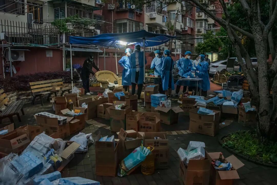 在蒋福明的照片中还有一张非常特别,大大小小的纸箱布满了小区的小花园,纸箱里装着大米、食用油、卷纸、垃圾袋等生活物资,天色渐晚,在小区小花园里的几位社区工作者、志愿者仍就着微弱的灯光核对发票、表格,为居民分装物资。这是在4月上旬物资十分紧张的阶段,小区为居民们组织的一次“集体团购”过程中留下的影像。