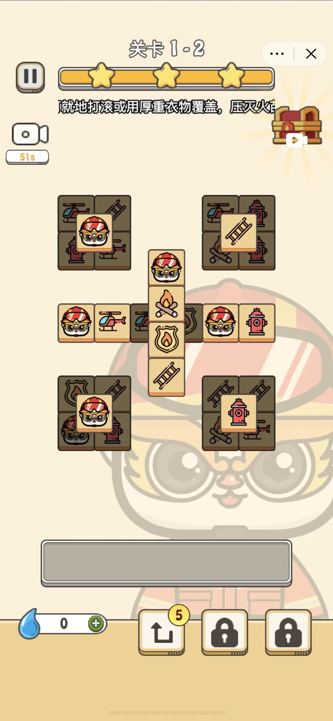 遇到难以通过的关卡,可以通过观看消防科普视频来获取道具;每次的通关页面都是一个消防科普知识的页面,并可以通过消防知识答题获得游戏道具和复活的机会。