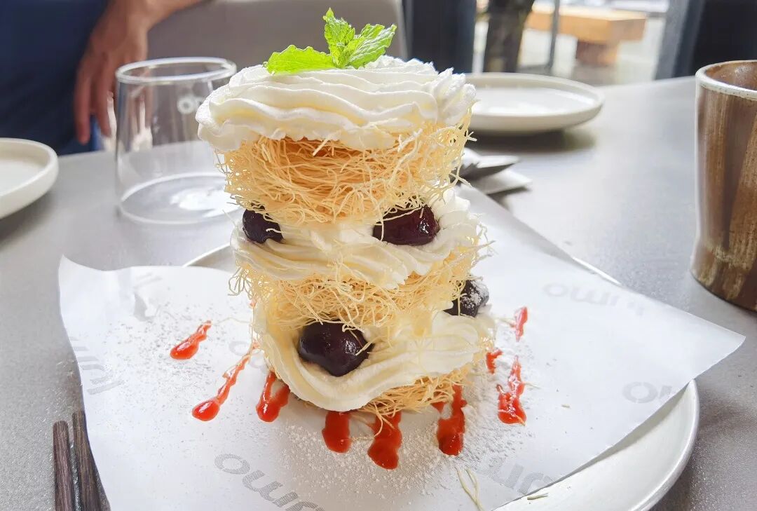 主厨改良了传统拿破仑,选用酥皮丝作底,经过不同方式处理的两层车厘子各具风味