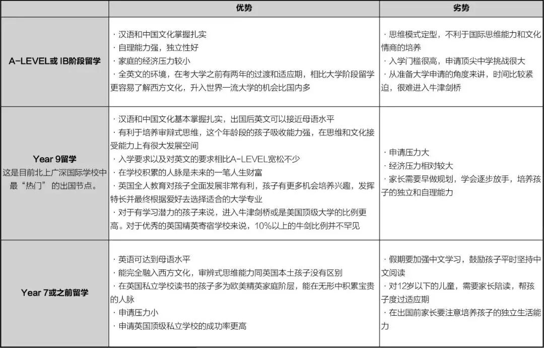 这些情况梳理好之后,结合三大节点留学的优劣势,找到一个最佳契合点,可能就是孩子最佳的留学时机。Katie以英国留学为例,从升学、孩子的发展、经济压力、申请难易程度、孩子作为中国人的文化认同等方面详细介绍了三大节点留学的优势与劣势。