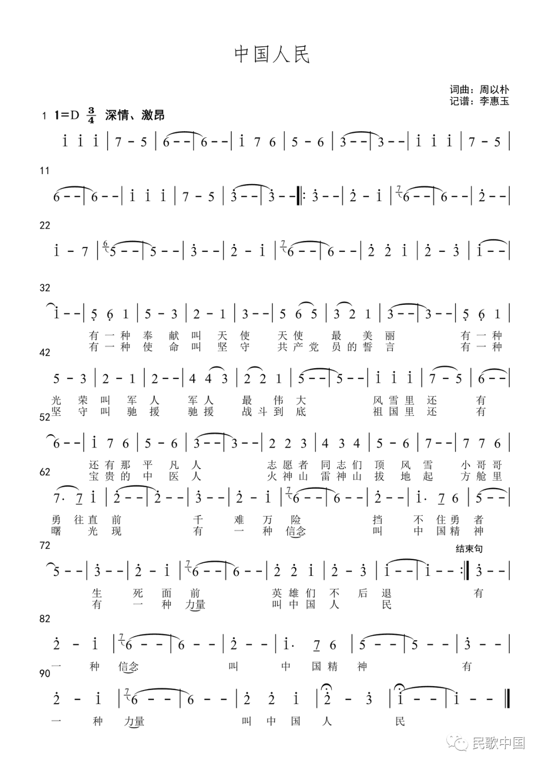 感人的报道和视频仍然源源不断的传来,一天十个小时不能吃喝的医护人员的奋力拼搏,全国各地冒死救死的白衣天使、伟大的人民解放军的全力驰援,社会上各个阶层自发的志愿者挺身而出,那些临危不惧、勇于救人的感人故事层出不穷。火神山、雷神山、方舱医院拔地而起......我们的党领导全国人民向这场瘟疫展开了殊死的搏斗!一个民族捍卫自己生存权力的战斗在中国大地上波澜壮阔的打响了!我被这些平凡而伟大的人和事深深地感动着。我感到一首歌不足以抒发我的胸臆。情未了!还要写!2020年3月7日,正在看一个个抗疫报道的时候,就感到一股激情向胸口涌来。《中国人民》的曲子从我的心里流淌出来了!我又是一边记,一边流泪。原来浓浓的情感催生的音符是那么流畅啊!两天后歌词也从我心里出来了。“有一种奉献叫天使,天使最美丽;有一种光荣叫军人,军人最伟大;风雪里还有,还有那平凡人,志愿者同志们顶风雪,小哥哥勇往直前!千难万险,挡不住勇者,生死面前,英雄们不后退!有一种使命叫坚守,共产党员的誓言;有一种坚守叫驰援,驰援战斗到底!祖国里还有,宝贵的中医人,火神山、雷神山拔地起,方舱里曙光现!有一种信念叫中国精神,有一种力量叫中国人民!有一种信念叫中国精神,有一种力量叫中国人民!”这首歌把我心里想说的全都说出来了!真有一种畅快的感觉!