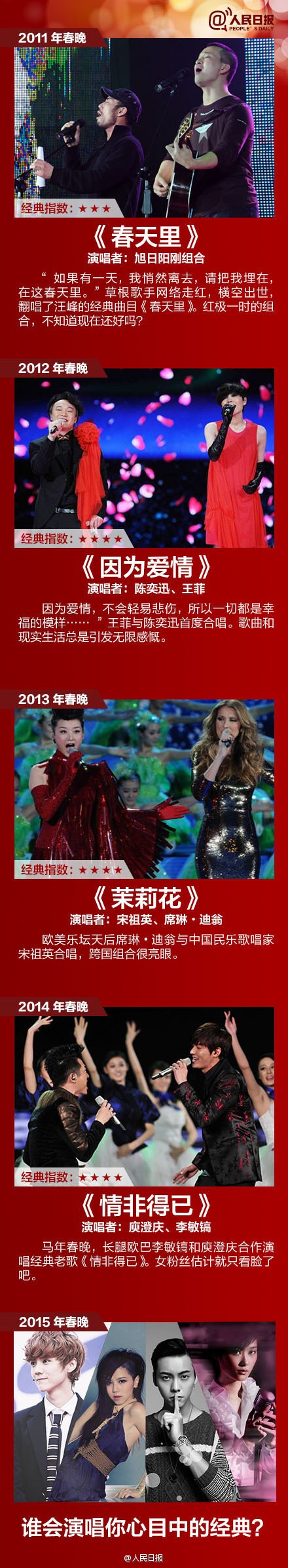 羊年春晚一天天临近了。从1983年算起,央视春晚已经经历了32年。除了《难忘今宵》,几乎每届春晚都会有标志性的金曲: