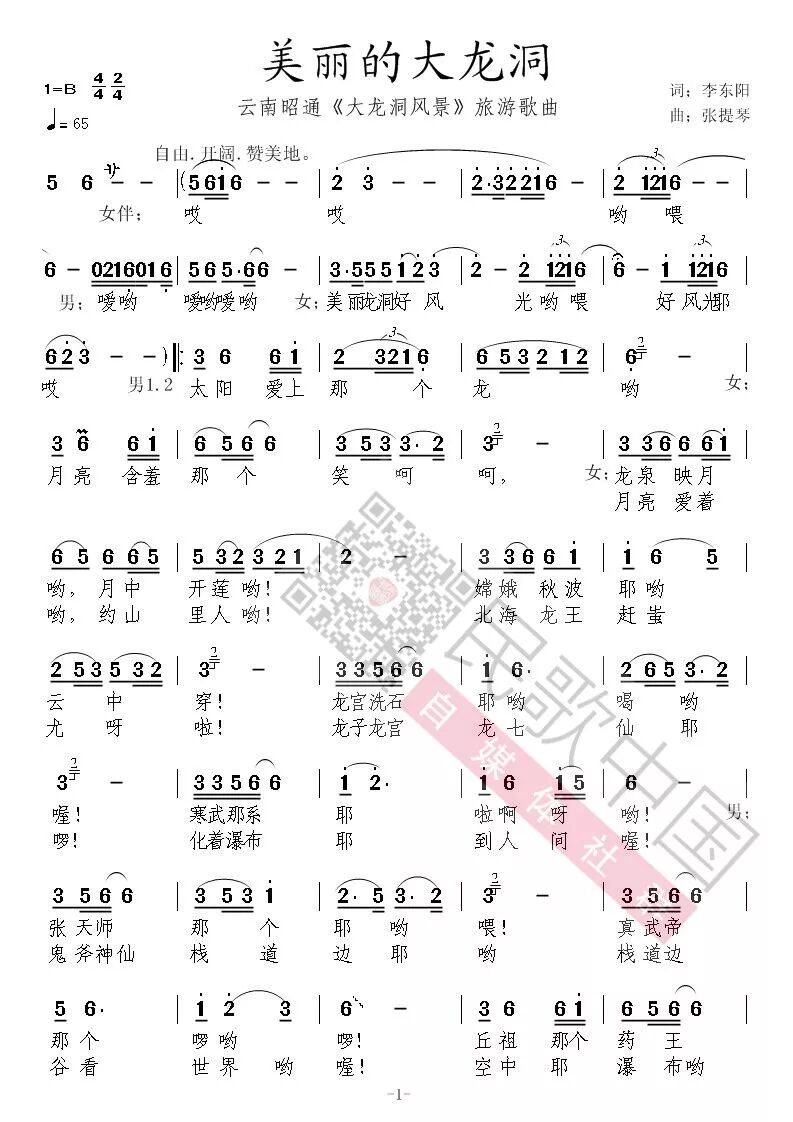 《美丽的大龙洞》是一首云贵高原昭通市“大龙洞风景区”的旅游歌曲,由李东阳作词,张提琴作曲,李敏(女声小组合)演唱。该作品词意紧扣仙岖故事人物,旋律将台湾高山族音乐元素与现代音乐相融合,优美而动人,配以女声甜美的嗓音,道出了原始神仙们内心丰富的情感世界以及如人间仙境般的大自然美景。