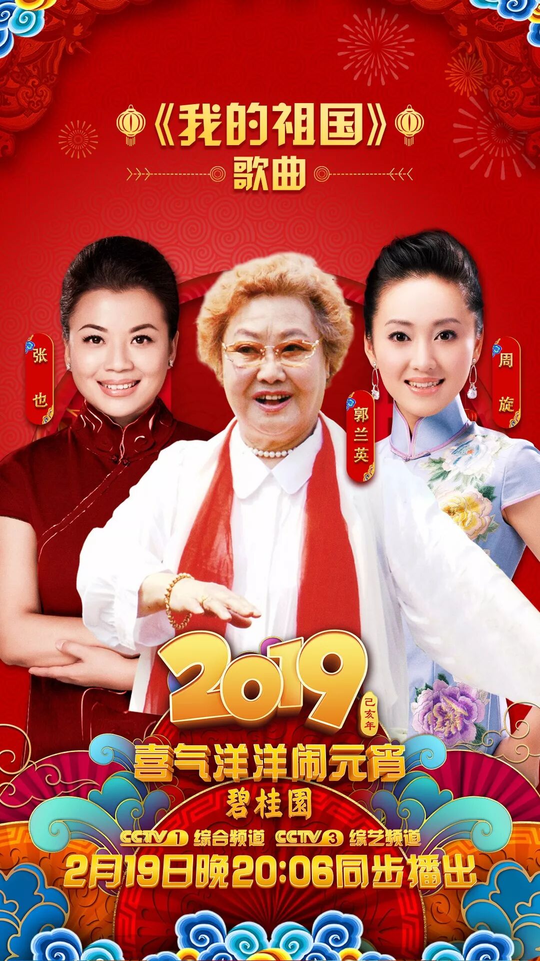 节目尾声,老一辈艺术家郭兰英老师将携手著名歌唱家张也、青年歌唱家周旋,带来我们最为熟悉的经典作品《我的祖国》。此外,李玉刚、王晰、王凯、谢娜、古巨基、景甜、古力娜扎等也都将精彩献艺。