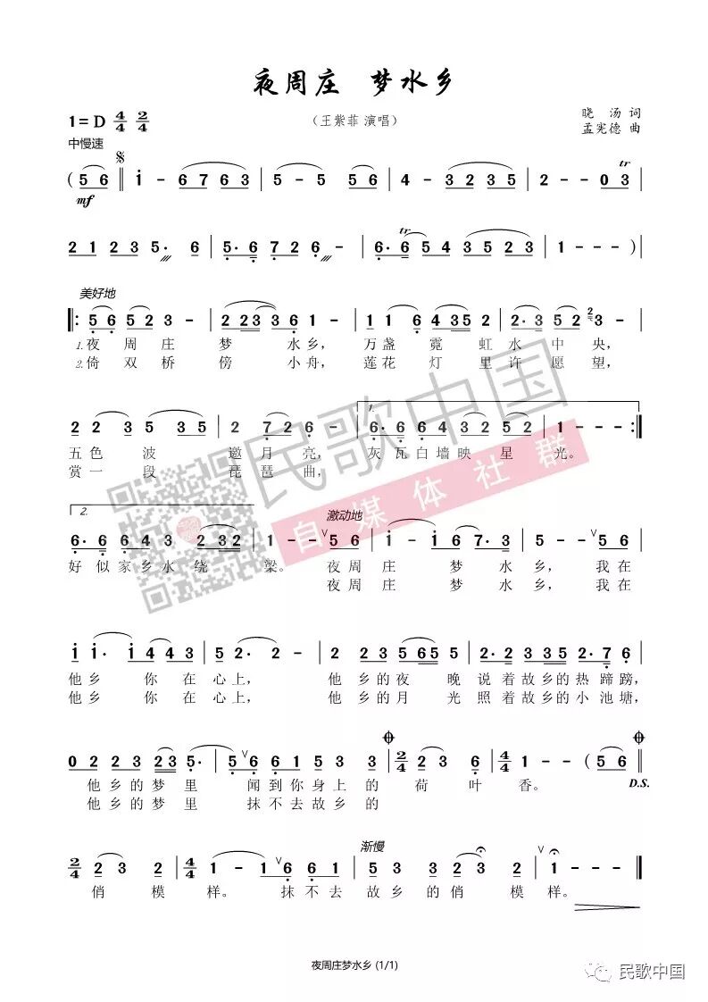 (注:由于上传数量限制,喜欢这首作品并需要伴奏的朋友,可加微信民歌君 leminge001 获取伴奏,添加时请备注“《夜周庄 梦水乡》伴奏”)