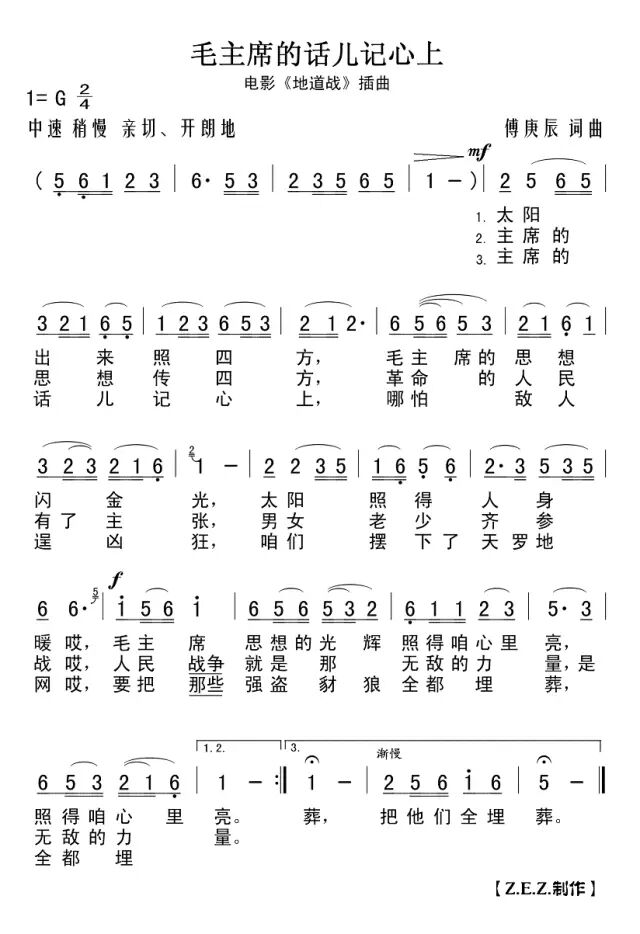 “主席的思想传四方,革命的人民有了主张,男女老少齐参战哎,人民战争就是那无敌的力量,无敌的力量……”《毛主席的话儿记心上》是1965年上映的老电影《地道战》的插曲,由我国著名作曲家傅庚辰创作,著名歌唱家邓玉华首唱。