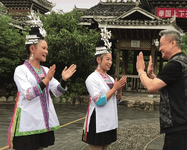 在采风过程中,发生了许多有趣的小插曲。比如,几位侗族姑娘给阎老师出了个难题——侗族对歌。这可一下子难倒了阎老师,人家不会侗语嘛。最终,聪慧的侗族姑娘巧妙地化解了这一难题。(↑上图↑)