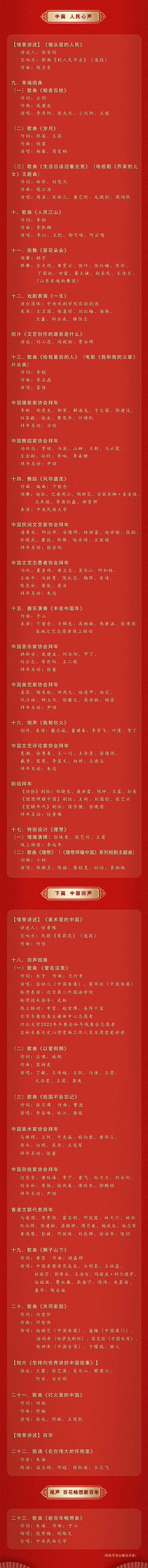 大年初一、初二、初三期间,百花迎春——中国文学艺术界2022春节大联欢将在河北卫视、河南卫视、江苏卫视、广东卫视、山东卫视、吉林卫视、北京卫视陆续播出,“学习强国”学习平台、中国艺术报新媒体、中国文艺网、百度、爱奇艺、MyTV Super Limited等网络平台也已上线。