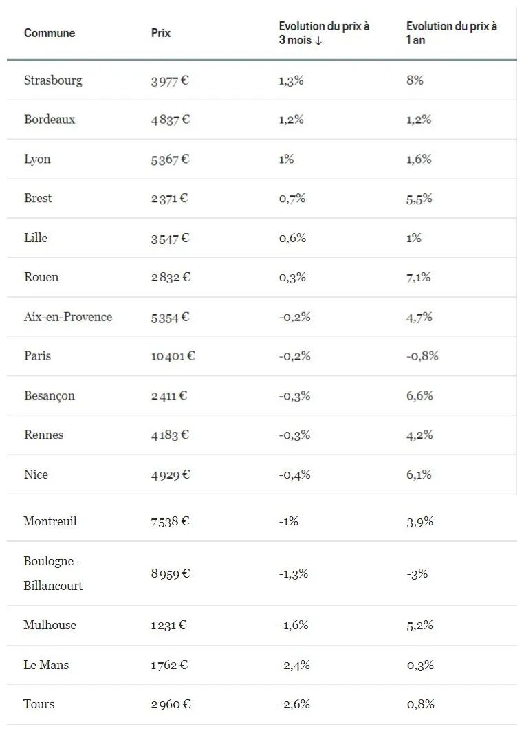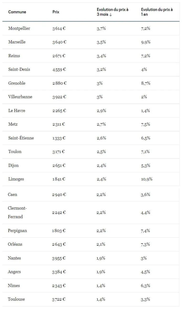 法国大城市房价情况(按最近三个月涨幅排名)