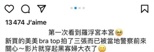 ▲ 当事人发帖称:“第一次看到罗(卢)浮宫本宫,新买的美美bra top拍了三张而已,被当地警察前来关心……影片就穿起黑寡妇大衣了。”(Instagram截图)