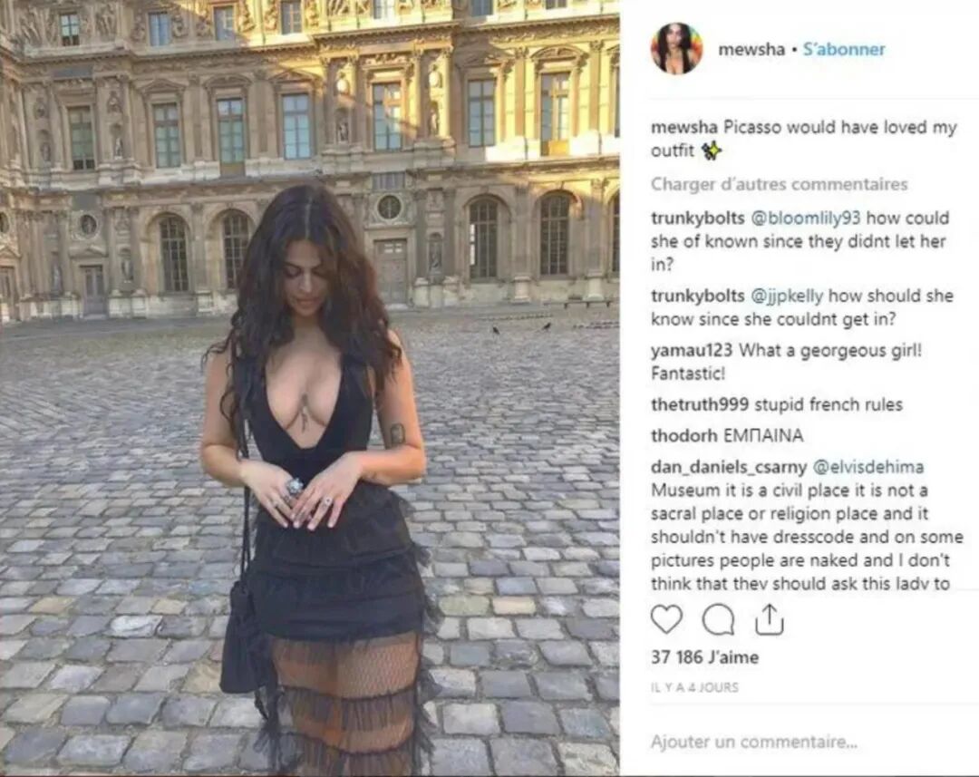 对于这一遭遇,有网友在评论区开玩笑说“警察是想认识你”,该网红澄清说“没有,是真的被驱赶”;另一些网友则批评她的穿搭不妥,“去那种场合怎么能穿那样……基本常识”,“文化不同,你穿那样当然被关切”;还有人表示在街头这样穿会被警察误认是“性工作者”;不过,也有人对警方的做法予以质疑,“法国人有这么保守吗?”,“法国不是最自由的国度吗?”。事实上,此前巴黎已有多家博物馆发生过游客因衣着问题被禁止入馆参观的先例。2018年11月,就有一名澳大利亚博主因为“衣着暴露”被卢浮宫安保人员禁止入馆。时年25岁的网红Newsha Syeh在Instagram上发帖表示,自己身穿黑色低胸薄纱长裙,但却被保安以“穿着暴露”为由禁止进入卢浮宫,“毕加索看了也会喜欢我的这身打扮”。Syeh气愤表示,问题就出在低胸上,自己遭到了“荡妇羞辱”。最后她不得不在身上披了件大衣才被允许入馆。据悉,卢浮宫网站虽然没有具体服装穿着规定,但明确禁止“穿泳衣、裸体、赤裸上身和赤脚”的访客入内。02 女子穿低胸装进奥赛博物馆被拒