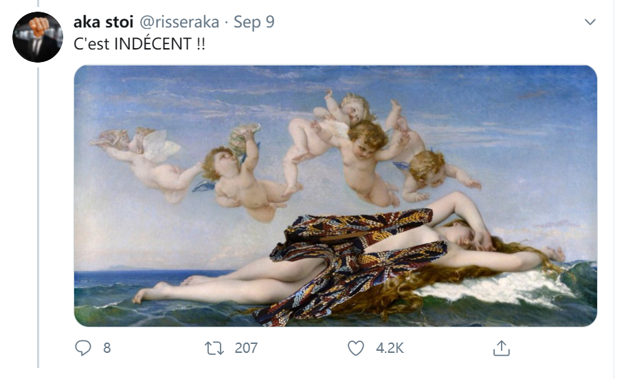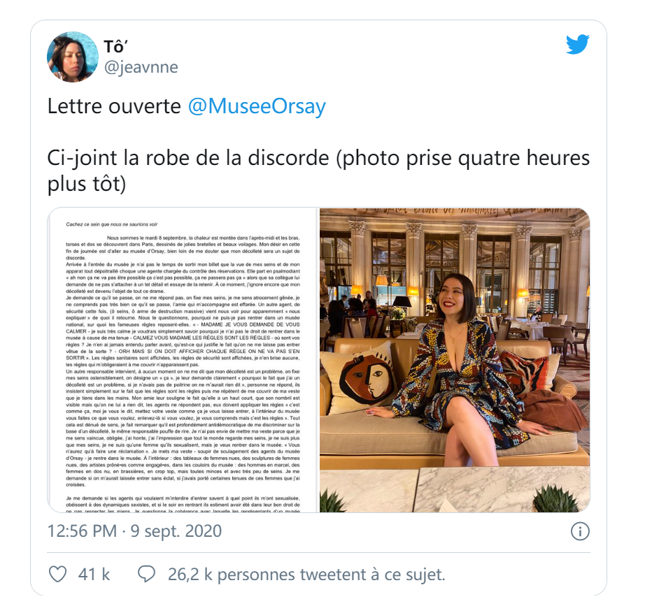 除了卢浮宫,挂着《世界的起源》等争议作品、一向以多元、包容姿态示人的巴黎奥赛博物馆,也因拒绝一名穿低胸衣女子入馆被推向舆论的风口浪尖。2020年9月,法国女生珍妮(Jeanne)打算与朋友一起参观奥赛博物馆。不料,珍妮刚抵达博物馆就被挡在门外,原因是她穿的低胸裙不符合奥赛博物馆的“入馆要求”。工作人员告诉她,想进馆就得遮盖一下胸部,“因为规定就是规定”。最终,珍妮不得不披上外套,才被允许进入。事件发生后的第二天,珍妮在自己的推特上发表长文描述当时的事件经过,并附上了一张她当天的着装照片。珍妮在文中写道:“当时我并不知道我的低胸裙成了这场闹剧的起因。”她描述称,自己来到博物馆入口,还没来得及拿出门票,一名女检票员就“炸毛”,不停念叨说“啊,不,这怎么能行,这可不行……”那时候,珍妮还完全没意识到发生了啥。在珍妮再三追问下,博物馆的工作人员始终没有明确说明问题出在哪里,最后只是冲着她的胸前指了指,说了声“那个”。虽然工作人员一直和珍妮说,不让进是因为她不符合博物馆“规定”,但却没人能明确指出她到底违反了哪项“规定”。更让人哭笑不得的是,工作人员还和珍妮说:“穿上外套,我就能放您进去。进馆之后,您想脱就脱,随便您。”另外,让珍妮感到更加不解的是,当天和她一起前往奥赛博物馆的朋友穿的是露脐短上衣,却没有遭到任何质疑和阻拦。▲ 有网友故意嘲讽奥赛博物馆,为博物馆展出的画作“穿上衣服”。(推特截图)