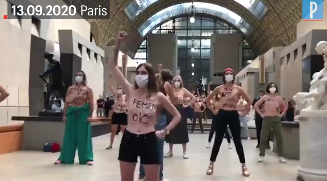 ▲ “低胸裙”事件发生后,20多名极端女权主义抗争团体FEMEN成员闯进奥赛博物馆示威,高喊“我们重申:我们的上半身不淫秽!我们支持珍妮和所有性别歧视的女性受害者!”“停止将女性身体性感化!”等口号。示威人员还在胸前写着“这不淫秽”“淫秽也是怪你们”“是你们的眼睛淫秽”等标语。当然,与珍妮一样,Femen示威者在入馆时也是穿着外套的。
