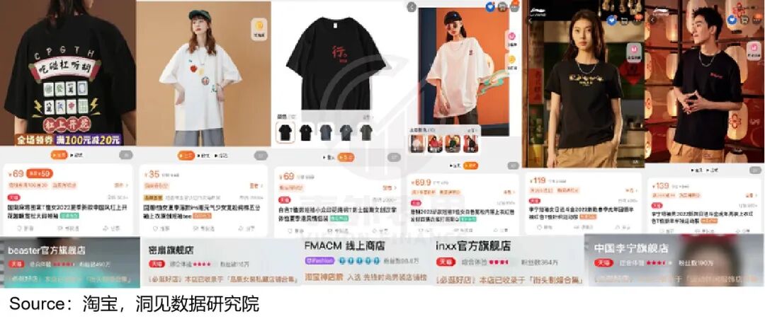 比如,中国李宁主打的国潮T恤,各类潮流品牌都有类似款。样式区别不大,而它们的价格是中国李宁的一半,性价比下,这些白牌的销量是中国李宁的一倍多。
