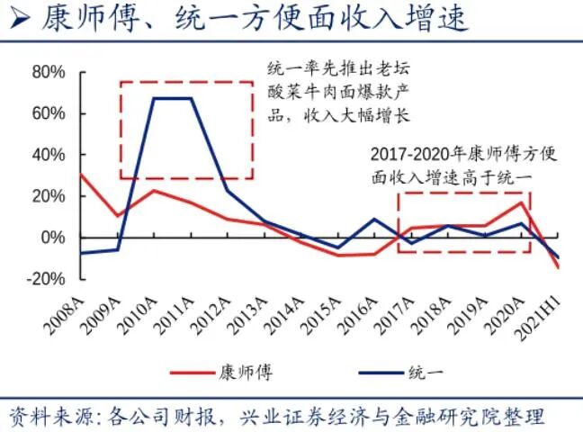 如下图,2017-2020年康师傅方便面的收入增速,已明显高于统一。
