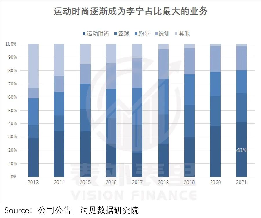 可以看到,2018-2021年,其运动时尚品类占比持续增长,2021年达到41%,成为销量贡献最大的板块。