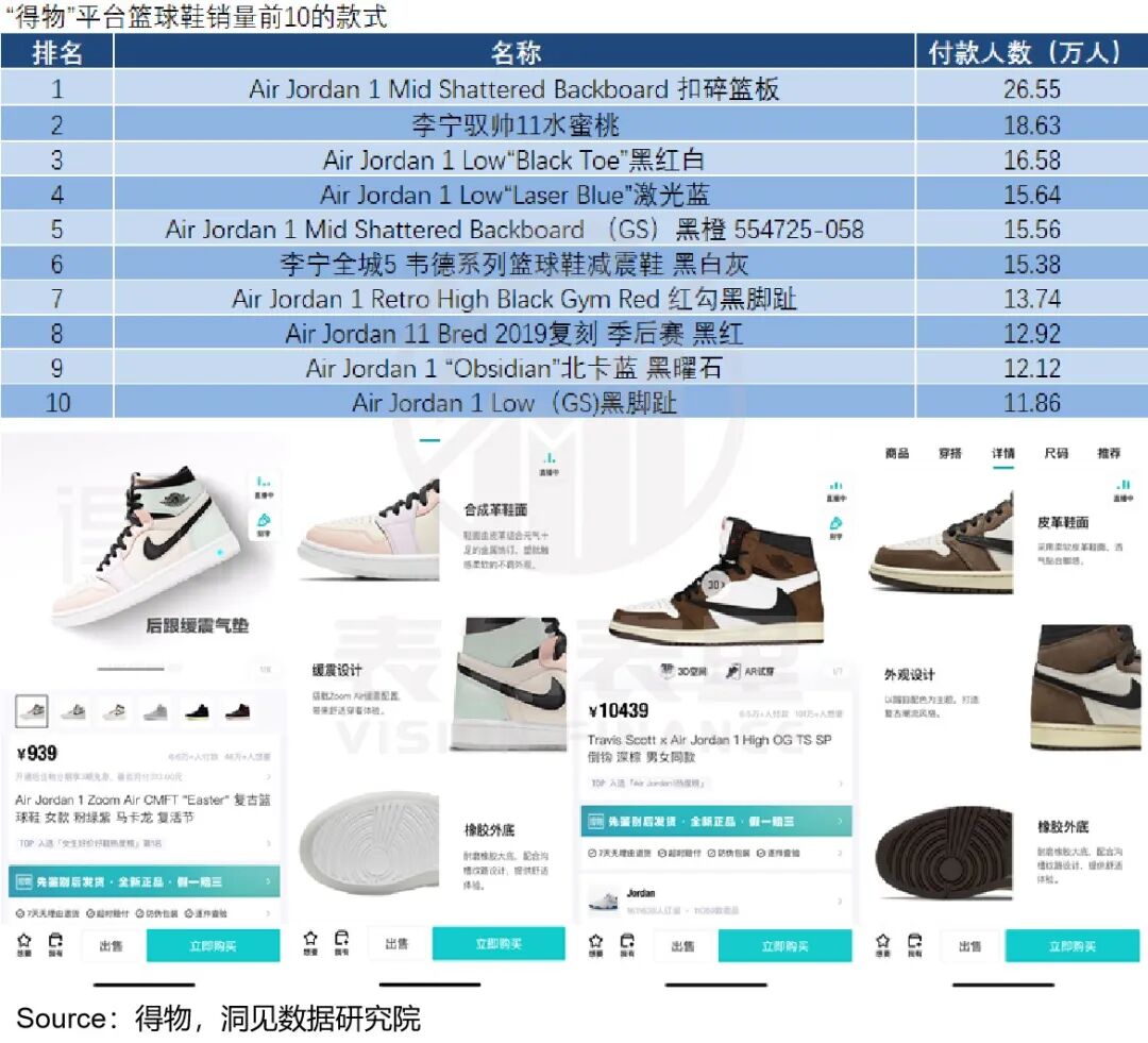 如下图,截至去年6月,得物平台篮球鞋销量top10榜单中,耐克AJ系列仍然占据着8个席位。