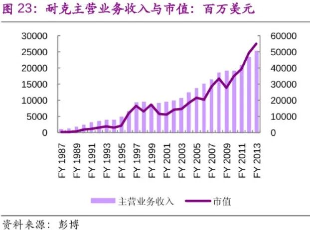 借此,耐克的业绩,持续稳定增长。这传导到资本市场上,就是1987年之后耐克的市值一路飙升,不断创新高。