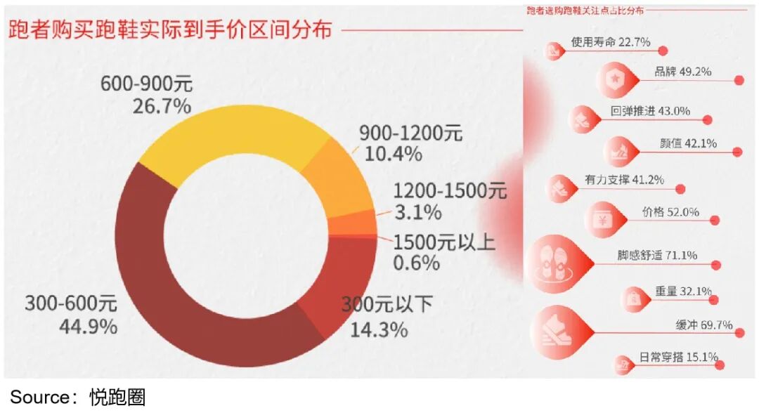 就刚性需求来说,用户对运动服饰安全、健康的考虑,永远排在第一位。如下图,跑者选购跑鞋,最在意的是舒适度和缓冲力等。